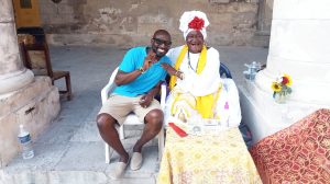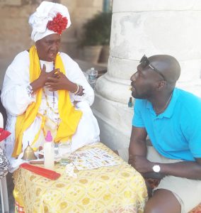 So, I bid my time and took the expected tourist picture but then I pointed to her cards, my IFA ilde/iddé and her bracelets and gestured my intent to have a reading. She immediately understood and gestured for me to sit down, sprayed some of her Florida Water on my hands and head and let me shuffle the cards and take out the first 12 cards. I had one of my colleagues translate her first few utterances but as we were on a schedule, we could not stay to hear its end but what I heard was enough for me to know the synchronicity of this divine moment.